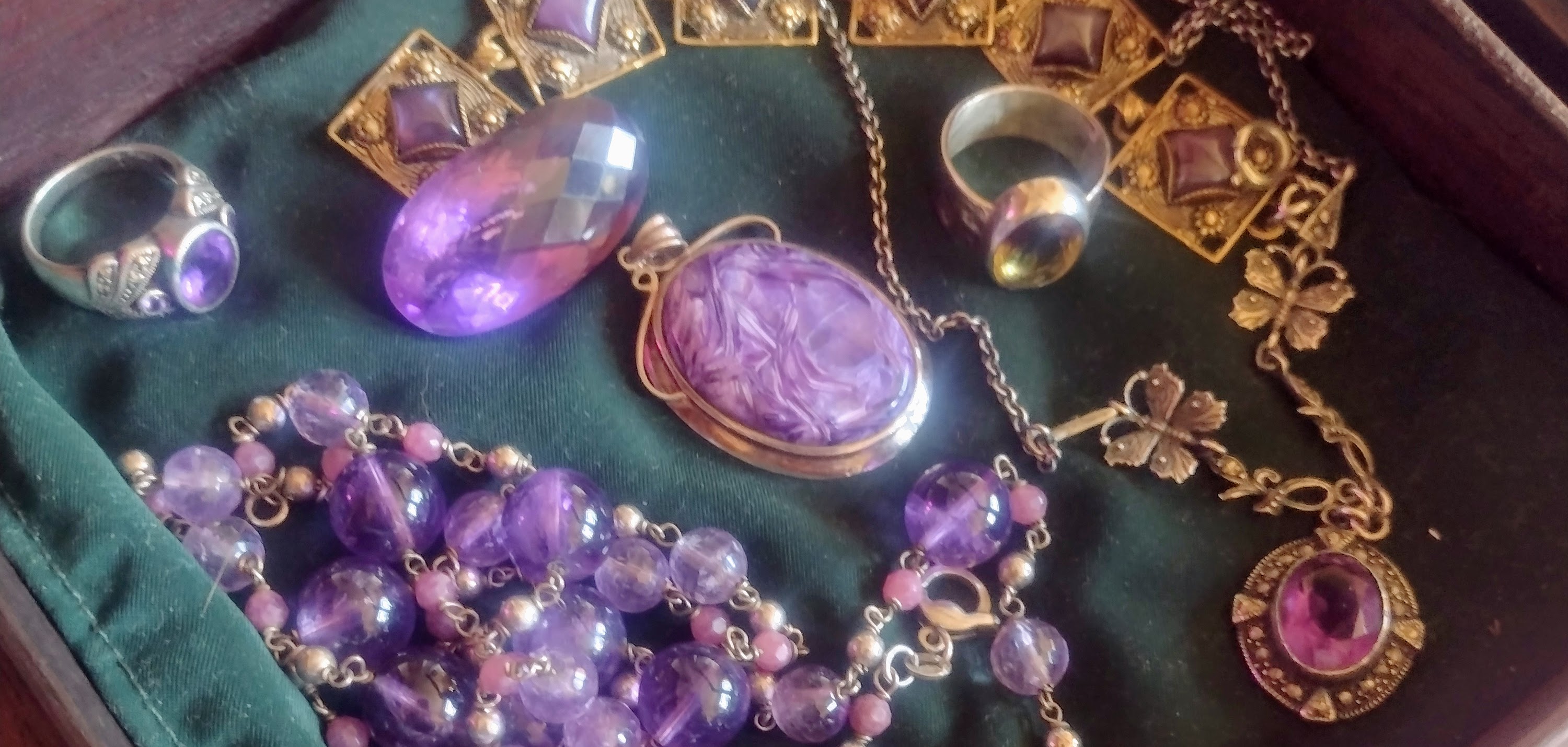 Uiteindelijk pak ik van de ‘afdeling paars’ een paar ringen en een hanger en doe ze om.