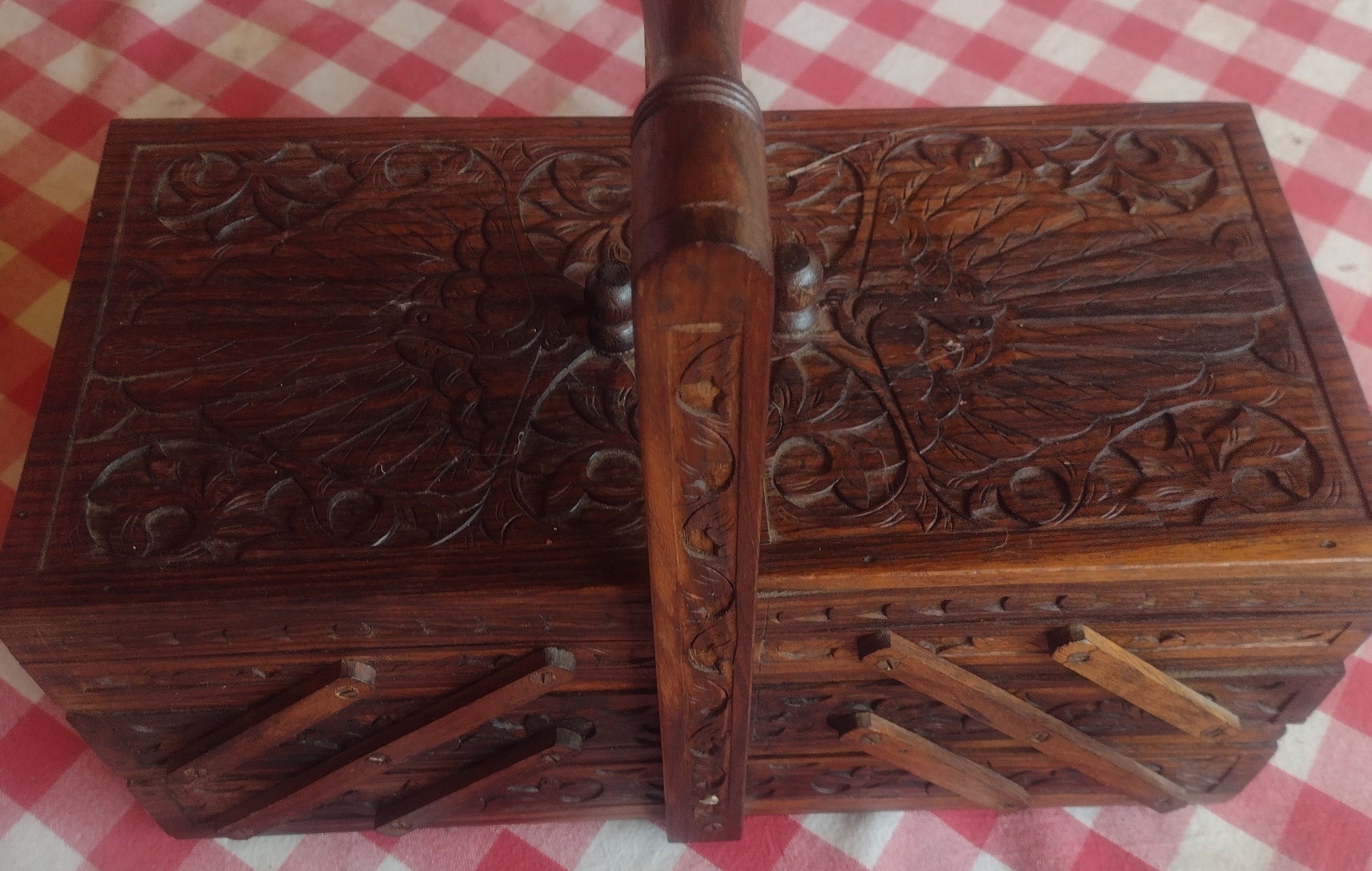 Op tafel staat een prachtige oude, houten naai- en fourniturenkist, van een klant.
