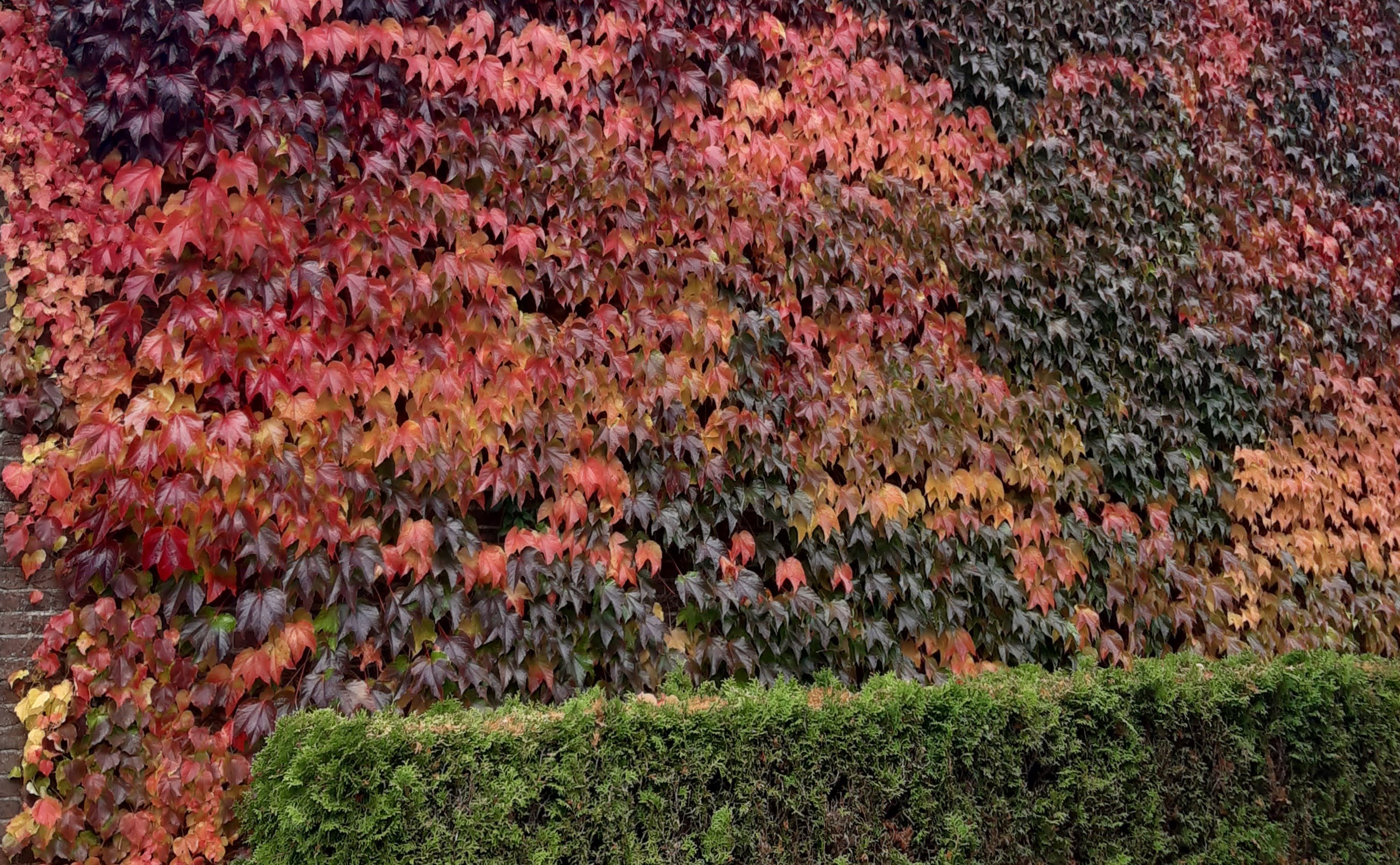 Achter de groene heg van de buurman zie je de bonte kleurenpracht van de wingerd aan de zijkant van ons huis