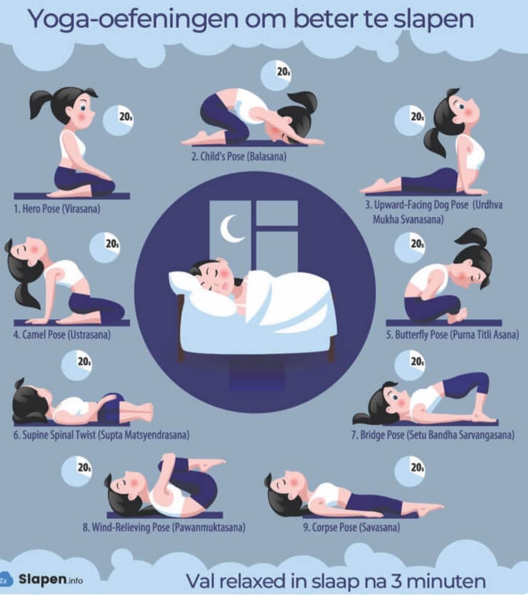 Als mijn lijf nog superwakker of onrustig voelt, pak ik een paar houdingen uit onderstaand plaatje. Iedere houding kan je 20 seconden vasthouden.